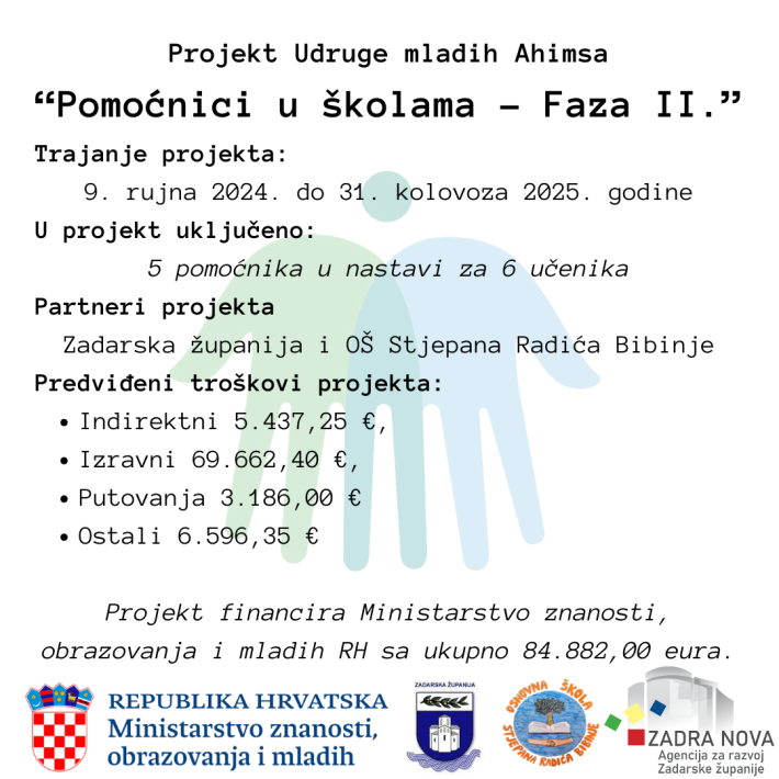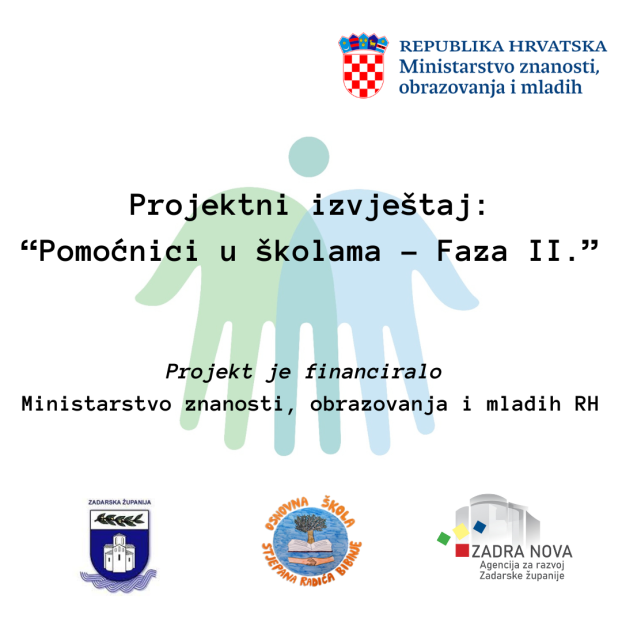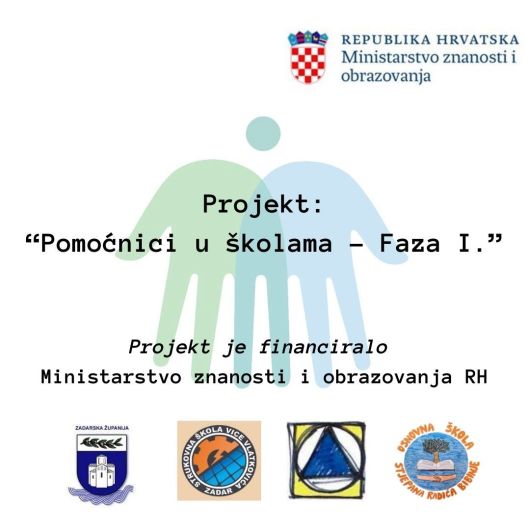 Projekt "Pomoćnici u nastavi - FazaI" financiran je sredstvima Ministarstva znanosti i obrazovanja. Kroz projekt smo ostvarili suradnju s Zadarskom županijom i njihovim školama Osnovna škola Bibinje, Škola prijmjenjene umjetnosti i dizajna Zadar i Strukovna škola Vice Vlatković.